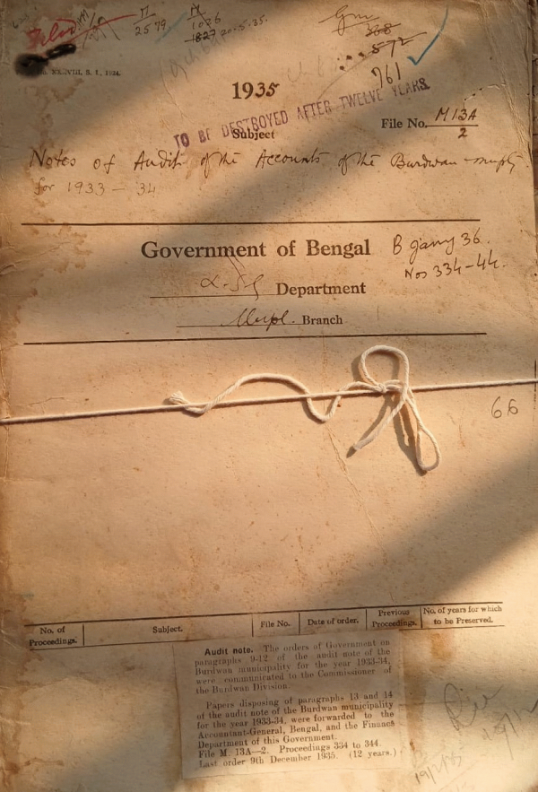 | Rack No. 12, Bundle No. 03 Sl No. 163 Adoption of the model by laws regarding the control etc, of dangerous diseases by the Chakdah Municipality. | Rack No. 12, Bundle No. 03 Sl No. 164 Revision of the existing scale of license fees for certain offensive and dangerous trades, Bally Municipality. | Rack No. 12, Bundle No. 03 Sl No. 165 Adoption of Model bye-laws for the control of dangerous disease by the Kushtia Municipality. | Rack No. 12, Bundle No. 03 Sl No. 166 Notes of Audit of the Accounts of the Burdwan Municipality for 1933-34. | Rack No. 12, Bundle No. 03 Sl No. 167 By-laws under section 414 of the Bengal Municipal Act, regulating Slaughter-houses for the Slaughter of animals meant for human consumption. | Rack No. 12, Bundle No. 03 Sl No. 168 Decision on resolutions. | Rack No. 12, Bundle No. 03 Sl No. 169 L.A. by the Serampore Municipality for the burning ghat at Ballarpur. |