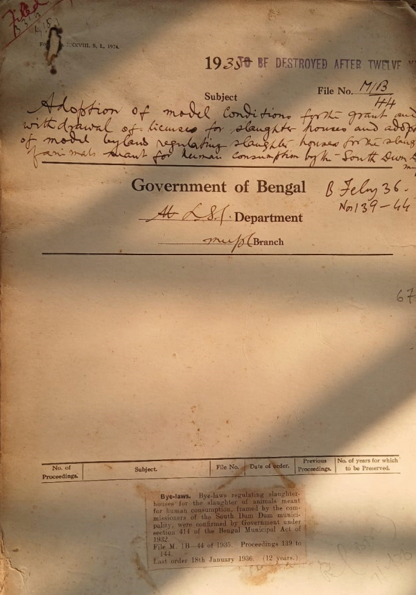 | Rack No. 12, Bundle No. 03 Sl No. 164 Revision of the existing scale of license fees for certain offensive and dangerous trades, Bally Municipality. | Rack No. 12, Bundle No. 03 Sl No. 165 Adoption of Model bye-laws for the control of dangerous disease by the Kushtia Municipality. | Rack No. 12, Bundle No. 03 Sl No. 166 Notes of Audit of the Accounts of the Burdwan Municipality for 1933-34. | Rack No. 12, Bundle No. 03 Sl No. 167 By-laws under section 414 of the Bengal Municipal Act, regulating Slaughter-houses for the Slaughter of animals meant for human consumption. | Rack No. 12, Bundle No. 03 Sl No. 168 Decision on resolutions. | Rack No. 12, Bundle No. 03 Sl No. 169 L.A. by the Serampore Municipality for the burning ghat at Ballarpur. | Rack No. 12, Bundle No. 03 Sl No. 170 Inspection note of the Arambagh Municipality. |