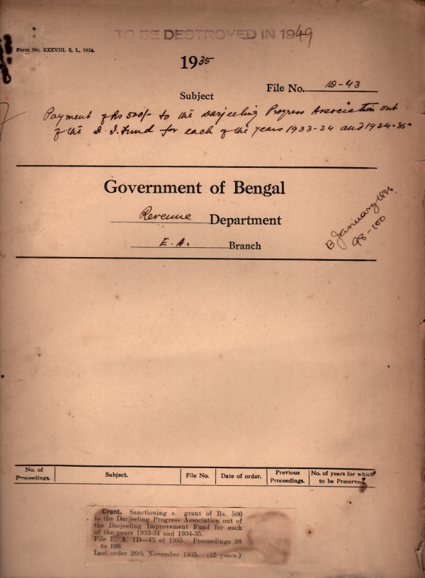 Sancitoning a grant of Rs. 500 to the Darjeeling Progress Association out of the Darjeeling Improvement Fund for each of the year 1933-34 and 1934-35.