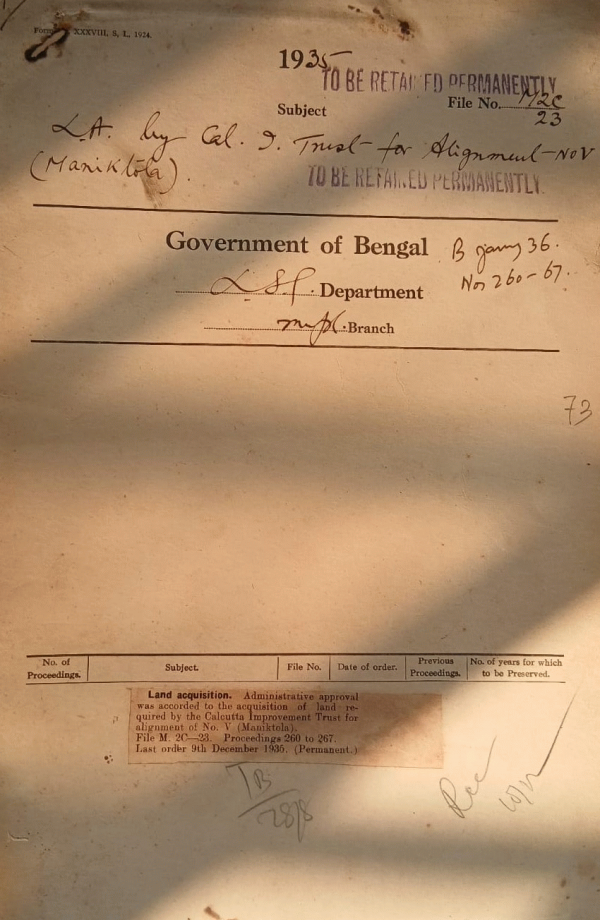 L.A. by Calcutta Improvement Trust for Alignment No. V (Maniktola).
