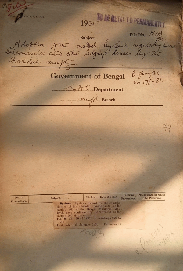 | Rack No. 12, Bundle No. 03 Sl No. 171 Proposed extension of the benefit of the provident fund to Certain employees of the Chandpur Municipality. | Rack No. 12, Bundle No. 03 Sl No. 172 11-35/35 L.A. by the Dacca Municipality for the improvement of the Rajshahi Bazar Bridge. | Rack No. 12, Bundle No. 03 Sl No. 173 L.A. by Calcutta Improvement Trust for Alignment No. V (Maniktola). | Rack No. 12, Bundle No. 03 Sl No. 174 Adoption of the model by laws regulating Sarais, Dharmasalas and other lodging houses by the Chakdah Municipality. | Rack No. 12, Bundle No. 03 Sl No. 175 Adoption of model by-laws for the control of dangerous diseases by the South Dum Dum Municipality. | Rack No. 12, Bundle No. 03 Sl No. 176 Adoption of model by-laws regulating Slaughter houses by the Chakdeh Municipality. | Rack No. 12, Bundle No. 03 Sl No. 177 Adoption of the model by-laws regulating to Public Water Supply etc by the Midnapore Municipality. |