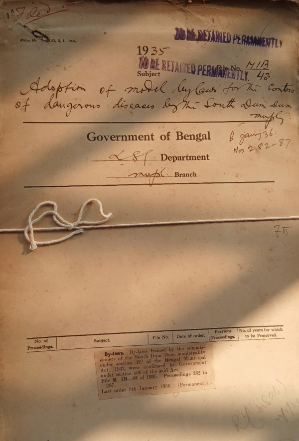 | Rack No. 12, Bundle No. 03 Sl No. 172 11-35/35 L.A. by the Dacca Municipality for the improvement of the Rajshahi Bazar Bridge. | Rack No. 12, Bundle No. 03 Sl No. 173 L.A. by Calcutta Improvement Trust for Alignment No. V (Maniktola). | Rack No. 12, Bundle No. 03 Sl No. 174 Adoption of the model by laws regulating Sarais, Dharmasalas and other lodging houses by the Chakdah Municipality. | Rack No. 12, Bundle No. 03 Sl No. 175 Adoption of model by-laws for the control of dangerous diseases by the South Dum Dum Municipality. | Rack No. 12, Bundle No. 03 Sl No. 176 Adoption of model by-laws regulating Slaughter houses by the Chakdeh Municipality. | Rack No. 12, Bundle No. 03 Sl No. 177 Adoption of the model by-laws regulating to Public Water Supply etc by the Midnapore Municipality. | Rack No. 12, Bundle No. 03 Sl No. 178 By laws regarding slaughter houses framed by the commissioners of the Jalpaiguri Municipality under Section 414 of the Bengal Municipal Act, 1932, were Confirmed. |