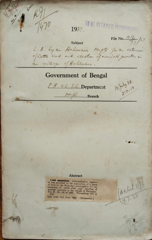 | Rack No. 12, Bundle No. 12, Sl No. 764 Adoption of Bye-laws by The Dacca Municipality. | Rack No. 12, Bundle No. 12, Sl No. 765 Inspection Note, Bhadreswar Municipality. | Rack No. 12, Bundle No. 12, Sl No. 766 Appointment of Chairman of the old Malda Municipality. | Rack No. 12, Bundle No. 12, Sl No. 767 L.A. by the Halishar Municipality for the extension of Cattle Shed and erection of menials quarters in the village of Halishar. | Rack No. 12, Bundle No. 12, Sl No. 768 Change in the designation of 'European Fireman' as 'Fire men' owning to the appointment of Indians in Calcutta Fire Brigade. | Rack No. 12, Bundle No. 12, Sl No. 769 Personal allowance of Rs. 20/- per month to the Secretary Muhammadan Burial Board. | Rack No. 12, Bundle No. 12, Sl No. 770 Proposed Splitting up of conservancy rate u/s 121(d) B.M. Act, 1932. |