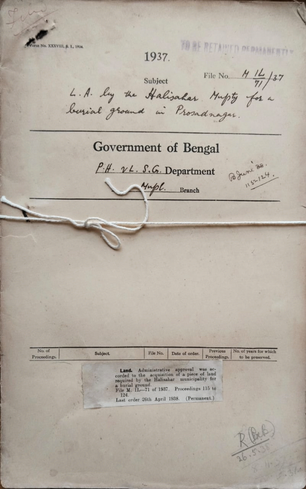 | Rack No. 12, Bundle No. 12, Sl No. 769 Personal allowance of Rs. 20/- per month to the Secretary Muhammadan Burial Board. | Rack No. 12, Bundle No. 12, Sl No. 770 Proposed Splitting up of conservancy rate u/s 121(d) B.M. Act, 1932. | Rack No. 12, Bundle No. 12, Sl No. 771 Adoption of the model Building by-laws with certain additions by the Katwa Municipality. | Rack No. 12, Bundle No. 12, Sl No. 772 L.A. by the Halishar Municipality for burial ground in Prosadnagar. | Rack No. 12, Bundle No. 12, Sl No. 773 Principals of Rating. | Rack No. 12, Bundle No. 12, Sl No. 774 L.A. Report 1931–32 Para 25 (iii) Dacca Municipality. | Rack No. 12, Bundle No. 12, Sl No. 775 L.A. by Jessore Municipality for the construction of a road at Bunapara (South of Water Works). |