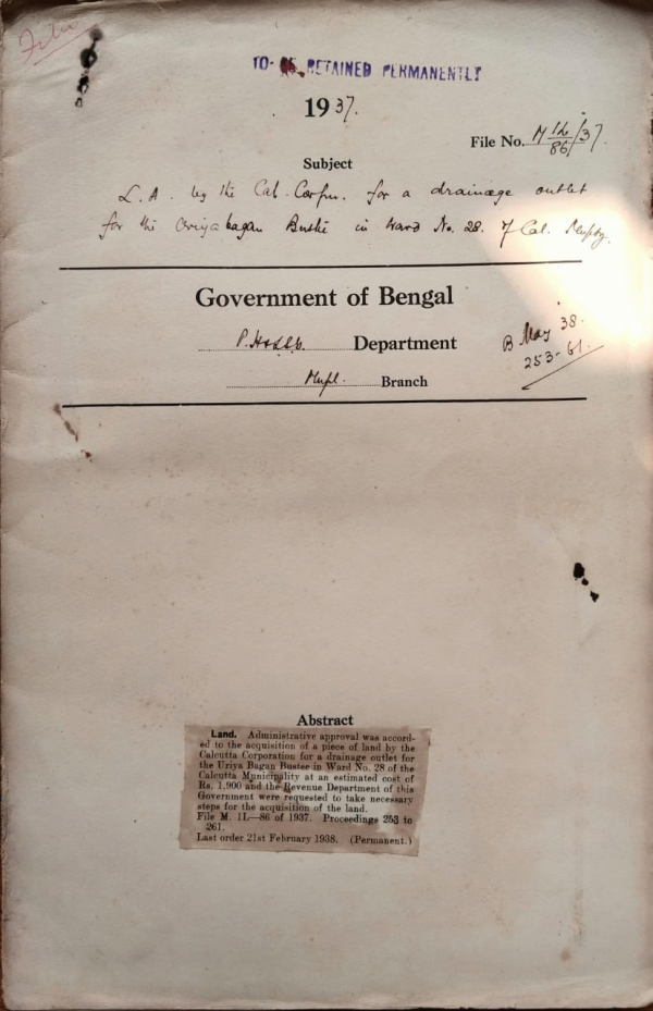 | Rack No. 12, Bundle No. 12, Sl No. 773 Principals of Rating. | Rack No. 12, Bundle No. 12, Sl No. 774 L.A. Report 1931–32 Para 25 (iii) Dacca Municipality. | Rack No. 12, Bundle No. 12, Sl No. 775 L.A. by Jessore Municipality for the construction of a road at Bunapara (South of Water Works). | Rack No. 12, Bundle No. 12, Sl No. 776 L.A. by the Calcutta Corporation for a drainage outlet for the Uriya Bagan Bustee in ward no. 28 of Calcutta Municipality. | Rack No. 12, Bundle No. 12, Sl No. 777 Audit Report on the Accounts of the Comilla Municipality for 1935–36. | Rack No. 12, Bundle No. 12, Sl No. 778 India Electricity Rules, 1922. | Rack No. 12, Bundle No. 12, Sl No. 779 Budget estimate of the Muhammadan Burial Board for the year 1939–38. |