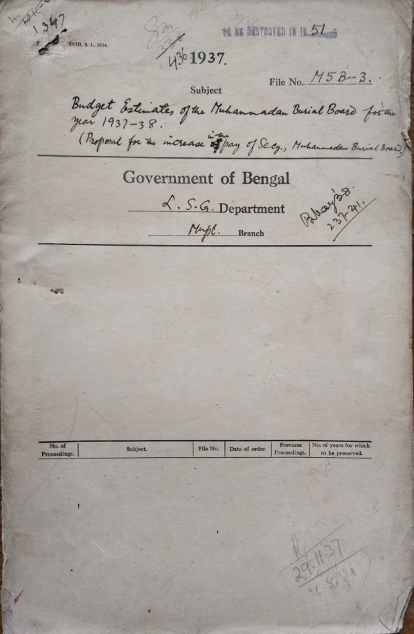 | Rack No. 12, Bundle No. 12, Sl No. 776 L.A. by the Calcutta Corporation for a drainage outlet for the Uriya Bagan Bustee in ward no. 28 of Calcutta Municipality. | Rack No. 12, Bundle No. 12, Sl No. 777 Audit Report on the Accounts of the Comilla Municipality for 1935–36. | Rack No. 12, Bundle No. 12, Sl No. 778 India Electricity Rules, 1922. | Rack No. 12, Bundle No. 12, Sl No. 779 Budget estimate of the Muhammadan Burial Board for the year 1939–38. | Rack No. 12, Bundle No. 12, Sl No. 780 Proposal for redacting the Conservancy rate of the Katwa Municipality. | Rack No. 12, Bundle No. 12, Sl No. 781 L.A. by the Jaynagar municipality for widening the cross road. | Rack No. 12, Bundle No. 12, Sl No. 782 L.A. by the Chittagong municipality for construction of a public latrine, dumping ground and a public road at Chaktai. |