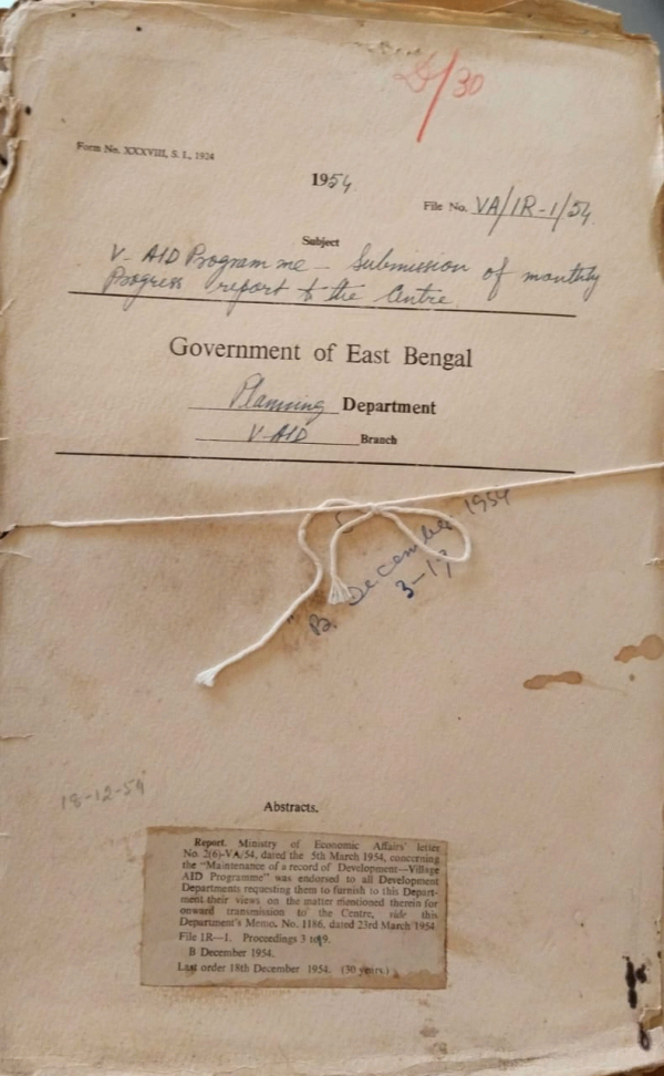 | Rack No. 37, Bundle No. 01, SI No. 02 Appointment and Training of Project Staffers responsibilities and integration. | Rack No. 37, Bundle No. 01, SI No. 03 V-AID programme Organizational Setup. | Rack No. 37, Bundle No. 01, SI No. 04 Jamalpur Training Institute Construction of Proceedings. | Rack No. 37, Bundle No. 01, SI No. 05 V-AID programme submission of monthly progress report to the centre. | Rack No. 37, Bundle No. 01, SI No. 06 Adult Education in East Bengal. | Rack No. 37, Bundle No. 01, SI No. 07 House allowance is granted to the trainees during their training at the village AID training Centre, video Planning Departments Memo, No-3042 dated the 8th July 1954. | Rack No. 37, Bundle No. 01, SI No. 08 Accounting procedure in respect of foreign aid. |