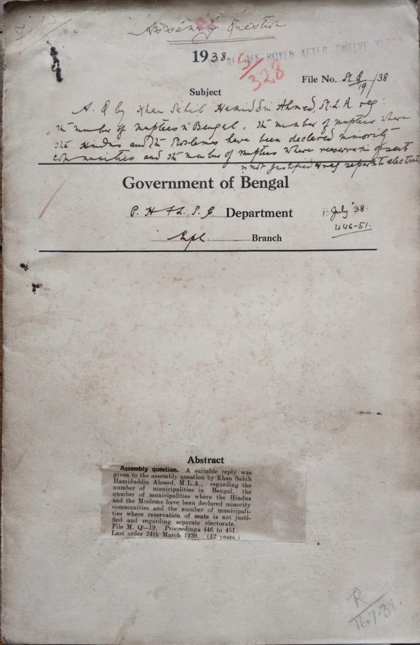 | Rack No. 12, Bundle No. 12, Sl No. 781 L.A. by the Jaynagar municipality for widening the cross road. | Rack No. 12, Bundle No. 12, Sl No. 782 L.A. by the Chittagong municipality for construction of a public latrine, dumping ground and a public road at Chaktai. | Rack No. 12, Bundle No. 12, Sl No. 783 Adoption of model Bye-laws for the regulation of places used for the purposes of offensive trades etc by Pabna Municipality. | Rack No. 12, Bundle No. 12, Sl No. 784 A.Q. by Khan Sahib Hamid Uddin M.L.A. regarding the number of municipalities in Bengal. | Rack No. 12, Bundle No. 12, Sl No. 785 Amendment in the Rules of business under Sub-Section (2) and (3) of the Section 59 of the govt. of India Act, 1935. | Rack No. 12, Bundle No. 12, Sl No. 786 Amendment in the Fundamental Rules u/s 241 of the govt. of India Act, 1935. | Rack No. 12, Bundle No. 12, Sl No. 787 Inspection Note Dum Dum Municipality. |