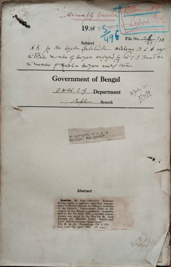 | Rack No. 12, Bundle No. 12, Sl No. 787 Inspection Note Dum Dum Municipality. | Rack No. 12, Bundle No. 12, Sl No. 788 A.Q. by Mr. Israil M.L.A. regarding the population, voters, number of elected seats and the number of Moslems returned in the Last election Kishorganj Municipality. | Rack No. 12, Bundle No. 12, Sl No. 789 C.Q. by Mr. Hamidul Haq Chowdhury regarding the Collection of Revenue of the C.I. trust in 1936-37 | Rack No. 12, Bundle No. 12, Sl No. 790 A.Q. by Mr. Syed Jalaluddin Hashemy, M.L.A. regarding the total number of employees, engaged by the C.I. trust and the number of Muslim lawyers. | Rack No. 12, Bundle No. 12, Sl No. 791 A.Q. by Mvi. Md. Ishaque, M.L.A. regarding the general election of the Bogra Municipality. | Rack No. 12, Bundle No. 12, Sl No. 792 A.Q. by Khan Bahadur Abidur Reza Chowdhury, the Chairman C.I. Trust. | Rack No. 12, Bundle No. 12, Sl No. 793 Petition of Babu Santosh Kumar Roy for removal of disqualification for appointment under the Calcutta Corporation. |