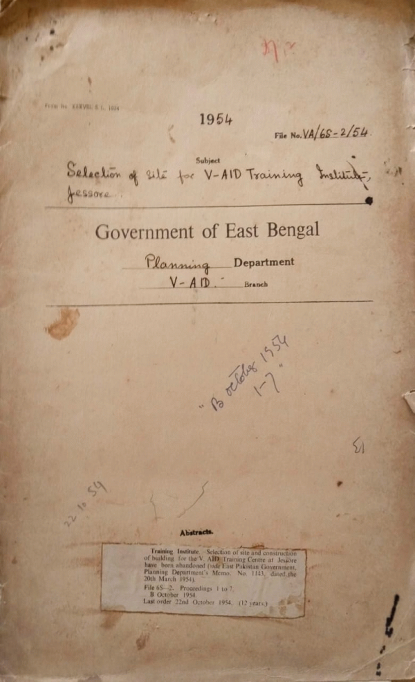 | Rack No. 37, Bundle No. 01, SI No. 15 Maintenance of Stock and Issue Register for T.C.A. equipment. | Rack No. 37, Bundle No. 01, SI No. 16 Actuaries of the Committee appointed to examine in detail certain aspect of village AID programme. | Rack No. 37, Bundle No. 01, SI No. 17 Village AID programme Channel of Correspondence between the central and provincial Government. | Rack No. 37, Bundle No. 01, SI No. 18 Selection of Site for V-AID training institute Jessore. | Rack No. 37, Bundle No. 01, SI No. 19 Acquisition of plots non-237, 240-242 of Khas Mahal land at Jamalpur for construction of buildings for the Training Center at Jamalpur. | Rack No. 37, Bundle No. 01, SI No. 20 Appointment of an-experienced non-official constructive works as project officer of a small project area. | Rack No. 37, Bundle No. 01, SI No. 21 Village Agricultural Industrial Development Programme. |