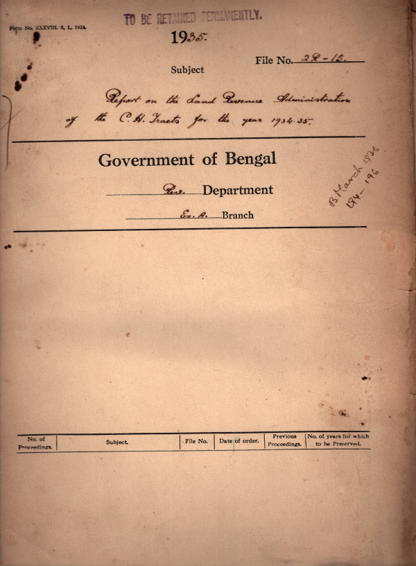 | Rack No. 39, Bundle No. 06, SI No. 348 Reporting of discusses on frontier of Nepal and British India. | Rack No. 39, Bundle No. 06, SI No. 349 Financing the reformed constitution. | Rack No. 39, Bundle No. 06, SI No. 350 Health Committee of District Board, Bengal. | Rack No. 39, Bundle No. 06, SI No. 351 Report on the land Revenue Administration of the C.H. Tracts for the year 1934-35. | Rack No. 39, Bundle No. 06, SI No. 352 His Excellency's Reply to the Address presented at Rangamati on 20th November 1935. | Rack No. 39, Bundle No. 06, SI No. 353 Rejecting a petition from one Manchafroo Mogh of Rajbila, Police Station Banderban, Chittagong Hill Tracts praying for the restoration of his lands resumed under orders of the Deputy Commissioner of the said Tracts owing to the petitioner's default in payment of rent. | Rack No. 39, Bundle No. 06, SI No. 354 Improvements to the residence of the Civil Surgeon at Rangamati. |