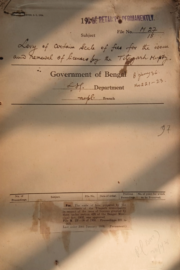 | Rack No. 12, Bundle No. 03 Sl No. 194 Work men's compensation Rules. | Rack No. 12, Bundle No. 03 Sl No. 195 Exemditure of Rs. 200/- for the repair of a-Portion of the Kailasdus Road lying beyond the limits of the Naihati Municipality. | Rack No. 12, Bundle No. 03 Sl No. 196 Amendment of the legal Practitioners Act, 1879 (Act XVIII of 1879) | Rack No. 12, Bundle No. 03 Sl No. 197 Levy of Certain Scale of fees for the issue and renewal of licenses by the Titagarh Municipality. | Rack No. 12, Bundle No. 03 Sl No. 198 Terminal and Pilgrim taxes realized by the East Indian Railway. | Rack No. 12, Bundle No. 03 Sl No. 199 L.A. by Calcutta Improvement Trust for Block No. II of Scheme No. XXXVII (Chittaranjan Avenue to Shambazar). | Rack No. 12, Bundle No. 03 Sl No. 200 Adoption of the model rules regarding the appointment of Municipal officers and Servants by the Tollygunge Municipality. |