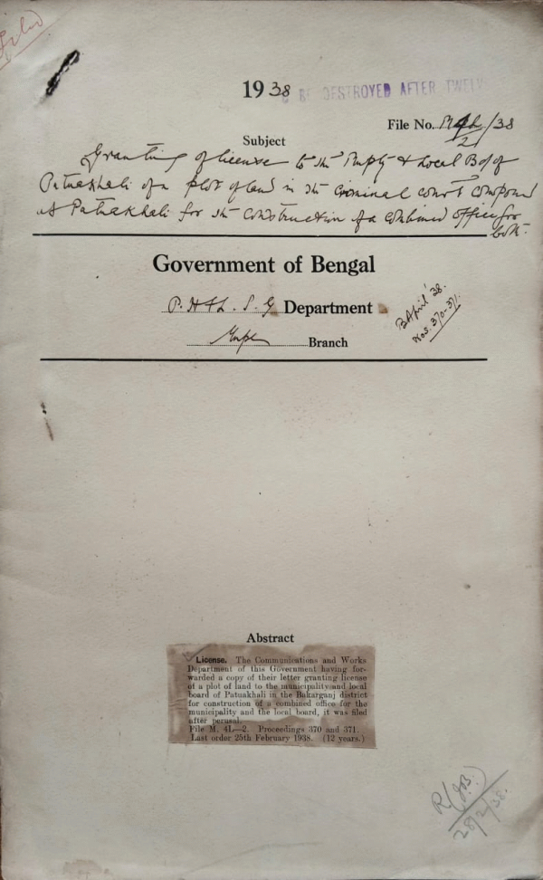 | Rack No. 12, Bundle No. 12, Sl No. 792 A.Q. by Khan Bahadur Abidur Reza Chowdhury, the Chairman C.I. Trust. | Rack No. 12, Bundle No. 12, Sl No. 793 Petition of Babu Santosh Kumar Roy for removal of disqualification for appointment under the Calcutta Corporation. | Rack No. 12, Bundle No. 12, Sl No. 794 Advance of Rs. 36000/- from revenue for through repairing to the Skimming Platform pending the raising of the loan. | Rack No. 12, Bundle No. 12, Sl No. 795 Granting of license to the Municipality & local board of Patuakhal in the Bakarganj District. | Rack No. 12, Bundle No. 12, Sl No. 796 Petition against the Candidature of Md. Hedayetullah Municipality. | Rack No. 12, Bundle No. 12, Sl No. 797 A.Q. by Mvi. Md. Israil, M.L.A. regarding the election of the Kishorganj Municipality. | Rack No. 12, Bundle No. 12, Sl No. 798 Procedure to the followed in an agreement between provincial govt. and Indian State. |