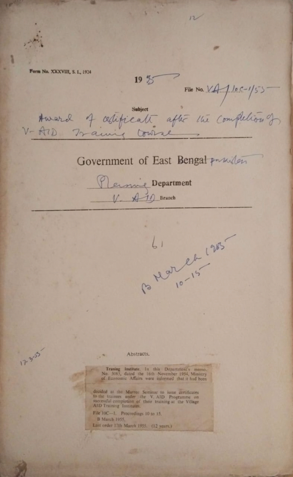 | Rack No. 37, Bundle No. 02, SI No. 44 Creation of a temporary post at Stenographer for the Director, V-AID programme. | Rack No. 37, Bundle No. 02, SI No. 45 Grant of a permanent advance of Rs. 200/- to the Director V-AID Programme. | Rack No. 37, Bundle No. 02, SI No. 45(A) Village AID-Programme Requirement of FOA equipment for 1954-55. | Rack No. 37, Bundle No. 02, SI No. 46 Award of certificates after the completion of V-AID Training course. | Rack No. 37, Bundle No. 02, SI No. 47 V-AID programme import of TCA equipment. | Rack No. 37, Bundle No. 02, SI No. 48 Establishment of the Directorate of village AID programme. | Rack No. 37, Bundle No. 02, SI No. 49 Sub-Divisional Development Committee Gaibandha Project Area. |
