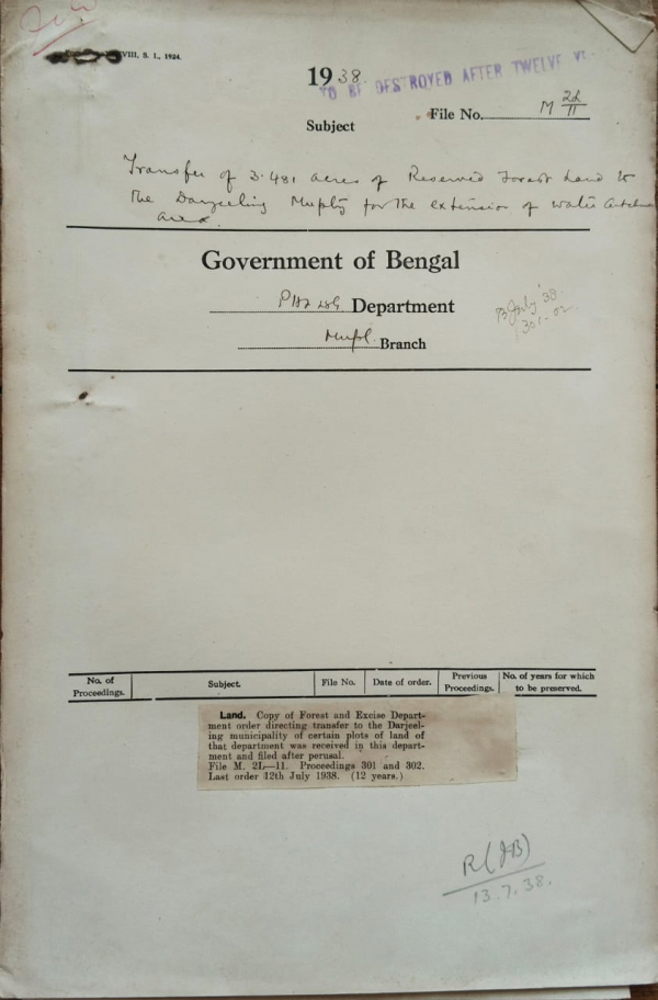 Transfer of 3.481 acres of Reserved forest land to the Darjeeling Municipality for the extension of water catchment area.