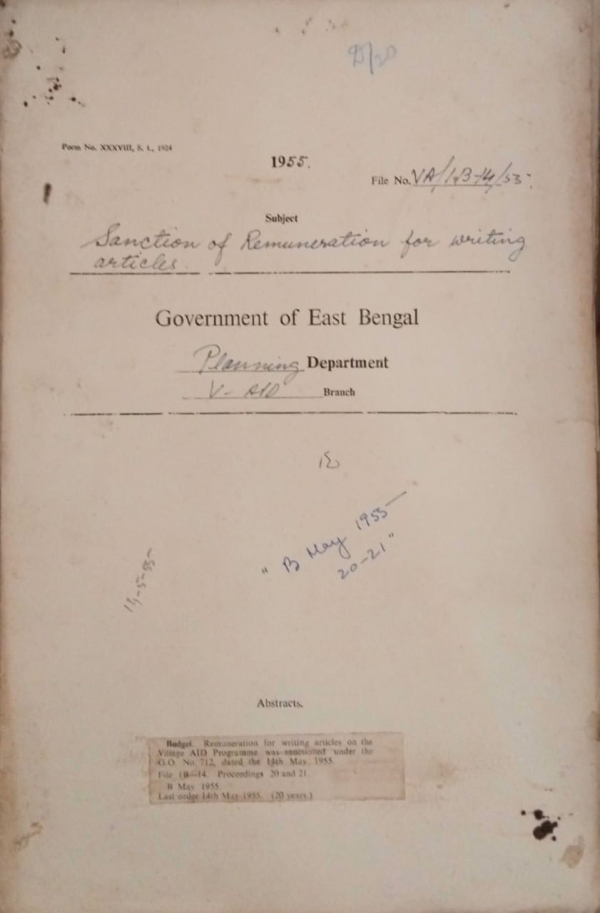 | Rack No. 37, Bundle No. 02, SI No. 57 Five years V-AID Plan Village Agricultural Industrial Development Programme at Pakistan 1955-60. | Rack No. 37, Bundle No. 02, SI No. 58 Tejgaon V-AID Training Institute Contingency Menials. | Rack No. 37, Bundle No. 02, SI No. 59 Planning Boards minutes & papers. | Rack No. 37, Bundle No. 02, SI No. 60 Sanction of Remuneration for writing articles. | Rack No. 37, Bundle No. 02, SI No. 61 Provincial V-AID seminar Bill at reception. | Rack No. 37, Bundle No. 02, SI No. 62 Shifting of the village AID Training Institute from Sylhet to Dacca. | Rack No. 37, Bundle No. 02, SI No. 63 Miscellaneous instructions for the Institutes & Development areas. |