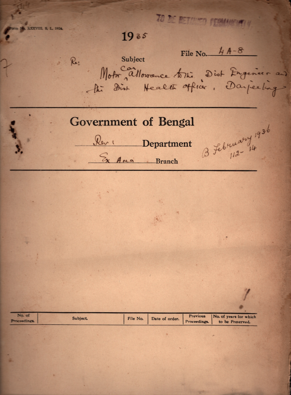 | Rack No. 39, Bundle No. 06, SI No. 374 Abolition of the Special pay of the Sub Assistant in Charge of Victoria Hospital Darjeeling. | Rack No. 39, Bundle No. 06, SI No. 375 Inspection note on Darjeeling District Board by the Commissioner Rajshahi. | Rack No. 39, Bundle No. 06, SI No. 376 Grant for Anti-Malarial Works for the Siliguri Union Board 1935-36. | Rack No. 39, Bundle No. 06, SI No. 377 Motor car allowance to the District Engineer and the District Health Officer, Darjeeling | Rack No. 39, Bundle No. 06, SI No. 378 Sanctioning the appointment of the Sub-Divisional officer, Kalimpong as a Director Unban Bank Limited. | Rack No. 39, Bundle No. 06, SI No. 379 Starling braches of Provident Fund. | Rack No. 39, Bundle No. 06, SI No. 380 Confirming the sentence of death passed on one Ekhaniya Tongchargya of the Chittagong Hill Tracts by the Commissioner of the Chittagong Division as ex-official Session Judge of the Chittagong Hill Tracts. |
