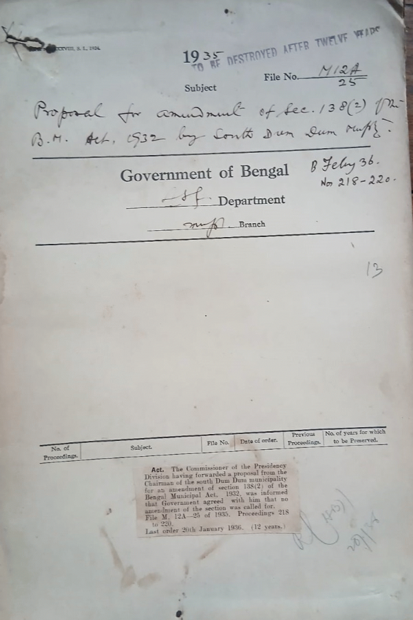 | Rack No. 12, Bundle No. 04 Sl No. 210 Adoption of the model by laws regulating Sarai's, 1935 Dharamsalas and other lodging houses by the Raniganj Municipality. | Rack No. 12, Bundle No. 04 Sl No. 211 Adoption of the model by laws regulating the conduct of business in places used for the Purposes by the Tamluk Municipality. | Rack No. 12, Bundle No. 04 Sl No. 212 Adoption of the model by laws regulating the Prevention of the Spread of Anthrax by the Berhampore Municipality. | Rack No. 12, Bundle No. 04 Sl No. 213 Proposal for amendment of Sec. 138(2) of the B.M. Act, 1932 by South Dum Dum Municipality. | Rack No. 12, Bundle No. 04 Sl No. 214 License on dangerous and offensive trades uttarpara Municipality. | Rack No. 12, Bundle No. 04 Sl No. 215 Dispute for setting aside the election of Munidra Deb Roy Mohasay as Chairman of the Bansberia Municipality. | Rack No. 12, Bundle No. 04 Sl No. 216 Declaration of Collin Street, Dhakuria Bagar Lane, Karim Bux Lane and Market Street as main thoroughfares. |