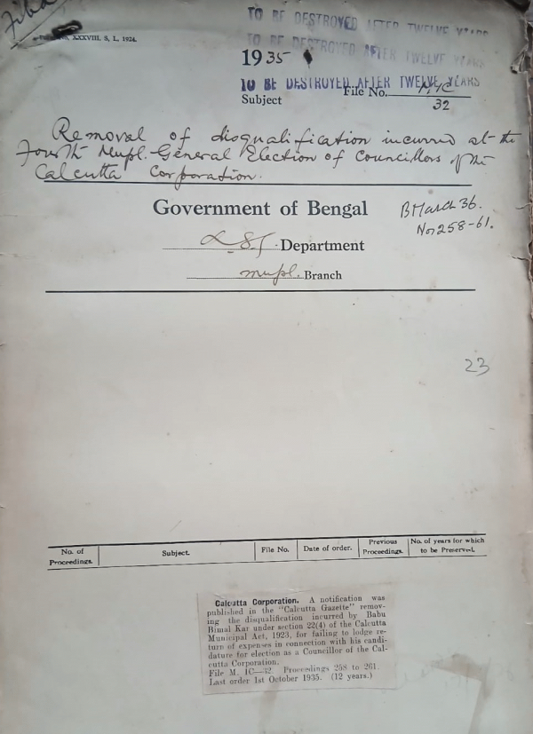 Removal of disqualification incurred at the Fourth Municipal General Election of Councilors of the Calcutta Corporation