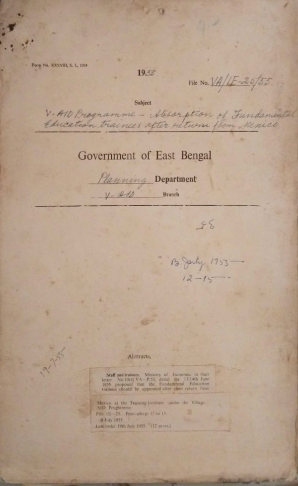| Rack No. 37, Bundle No. 02, SI No. 74 Public service commission in her memo no-16339 dated the 9th July 1955 intimates that the Government have decided to fill up 6 vacancies in the Eastern Pakistan Civil Service (Executive) by promotion from the Eastern Pakistan Junior Civil Service. | Rack No. 37, Bundle No. 02, SI No. 75 V-AID programme Instruction regarding health aspects. | Rack No. 37, Bundle No. 02, SI No. 76 V-AID Training Institute Appointment of Clerical Staff. | Rack No. 37, Bundle No. 02, SI No. 77 V-AID Programme Absorption of fundamental Education trainees after return from Mexico. | Rack No. 37, Bundle No. 02, SI No. 78 Appointment of part time lady doctor for the female trainees. | Rack No. 37, Bundle No. 02, SI No. 79 Appointment of clerical staff for the Daulatpur village AID Training Center. | Rack No. 37, Bundle No. 02, SI No. 80 V-AID Programme Provincial Summer 1955. |