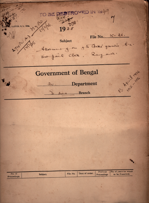 Allotment of one of the Clark quarters to the Sub-Jail Clark, Rangamati.