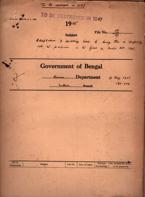 | Rack No. 39, Bundle No. 07, SI No. 408 Allotment of one of the Clark quarters to the Sub-Jail Clark, Rangamati. | Rack No. 39, Bundle No. 07, SI No. 409 Copy of letter No. 1332 P. dated 4th/3th May, 1935 from the Superintendent Government Printing Bengal to the Deputy Commissioner, Chittagong Hill Tracts Rangamati. | Rack No. 39, Bundle No. 07, SI No. 410 Resolution by the Municipal Commissioner of Darjeeling Municipality. | Rack No. 39, Bundle No. 07, SI No. 411 Adaptation of existing Bengal laws | Rack No. 39, Bundle No. 07, SI No. 412 Sanctioning the proposal for the partial dismantlement and readjustment of name structures attached to the Public Works Department Inspection Bungalow and Inspection Hut at Banderbans in the Chittagong Hill Tracts. | Rack No. 39, Bundle No. 07, SI No. 413 Amendments of rules under the village self-government Act, 1919. | Rack No. 39, Bundle No. 07, SI No. 414 Amendments of rules under the village self-government Act, 1919. |