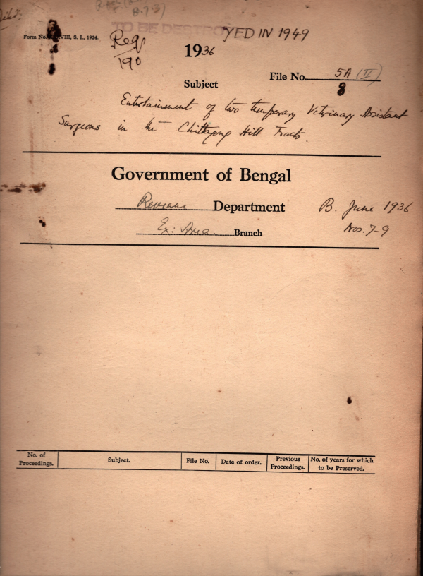 Entertainment of two temporary veterinary Assistant Surgeons in the Chittagong Hill Tracts.