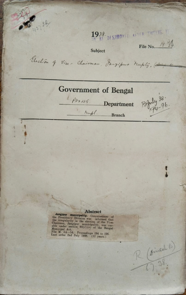 | Rack No. 12, Bundle No. 12, Sl No. 805 L.A. by the Brahmanbaria Municipality for a trenching ground at B. Baria. | Rack No. 12, Bundle No. 12, Sl No. 806 Apportionment of the cost of the Survey of the garder Reach Municipality area after its Separation from Calcutta Corporation. | Rack No. 12, Bundle No. 12, Sl No. 807 Amendment to Judgmental Rules u/s 241 of the govt. of India Act, 1935. | Rack No. 12, Bundle No. 12, Sl No. 808 Election of vice chairman Jangipur Municipality. | Rack No. 12, Bundle No. 12, Sl No. 809 Suspension of the resolution of the Howrah Municipality imposing a cut in the Salary of Municipal employs drawing above Rs. 50/- P.M. | Rack No. 12, Bundle No. 12, Sl No. 810 Petition from Babu Bama Charan Mallh for inclusive of his name in the list of Municipal Assessors for the Burdwan Division. | Rack No. 12, Bundle No. 12, Sl No. 811 Disconnection of the Darjeeling telephones of Honorable Ministers and Secretaries at the end 1st trip. |