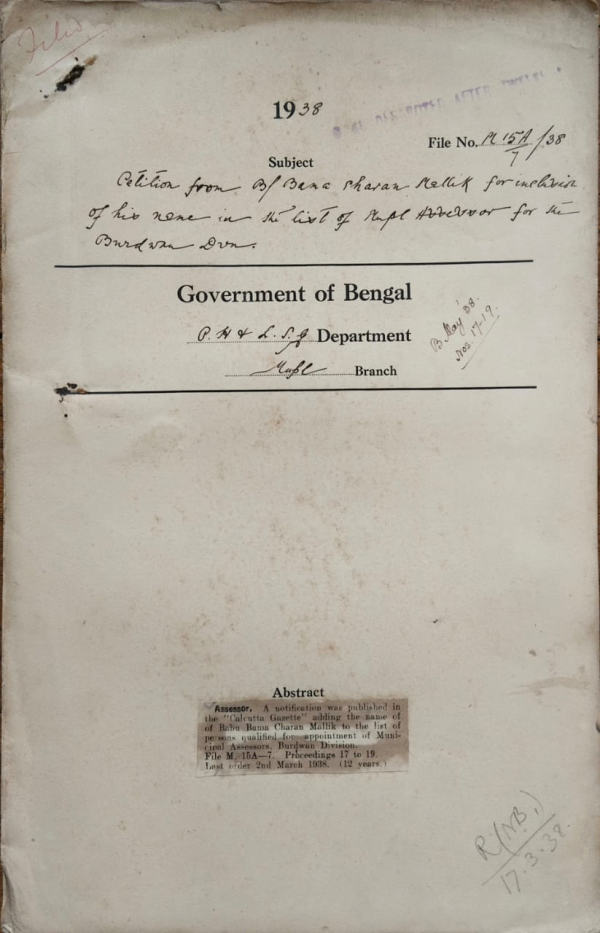 | Rack No. 12, Bundle No. 12, Sl No. 807 Amendment to Judgmental Rules u/s 241 of the govt. of India Act, 1935. | Rack No. 12, Bundle No. 12, Sl No. 808 Election of vice chairman Jangipur Municipality. | Rack No. 12, Bundle No. 12, Sl No. 809 Suspension of the resolution of the Howrah Municipality imposing a cut in the Salary of Municipal employs drawing above Rs. 50/- P.M. | Rack No. 12, Bundle No. 12, Sl No. 810 Petition from Babu Bama Charan Mallh for inclusive of his name in the list of Municipal Assessors for the Burdwan Division. | Rack No. 12, Bundle No. 12, Sl No. 811 Disconnection of the Darjeeling telephones of Honorable Ministers and Secretaries at the end 1st trip. | Rack No. 12, Bundle No. 12, Sl No. 812 Extension of the time of assessment to Midrapore Municipality. | Rack No. 12, Bundle No. 12, Sl No. 813 Exchange of Publications of this govt. of Ceylon. |