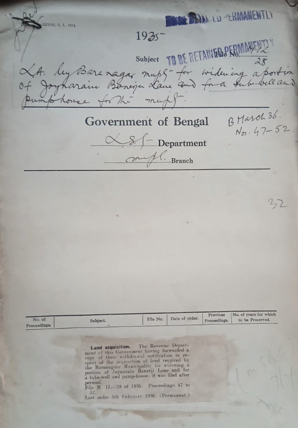 L.A. by Baranagore Municipality for widening a portion of Joynarain Banerji Lane and for a true well and Pumb-house for the Municipality.
