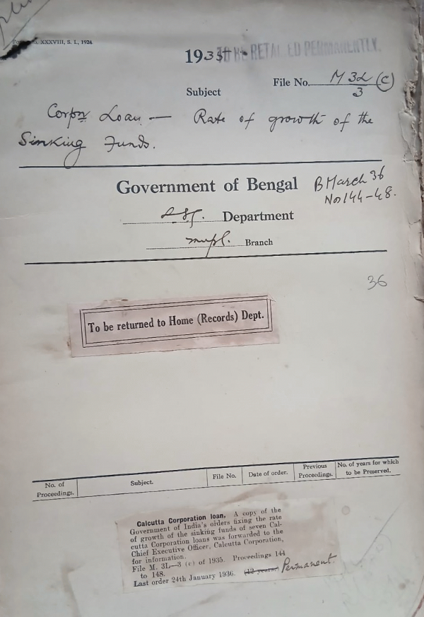 | Rack No. 12, Bundle No. 04 Sl No. 233 Exemption of the Christiar Cemetery at Tollygunj from the municipal rate on holdings under Section 124. B.M. Act. | Rack No. 12, Bundle No. 04 Sl No. 234 Removal of Babu Ramesh Chandra Section an elected commissioner from the Jamalpur Municipality. | Rack No. 12, Bundle No. 04 Sl No. 235 L.A. by the Calcutte Corporation for the extension of the Saradeswari Asram. | Rack No. 12, Bundle No. 04 Sl No. 236 Corporation loan-Rate of growth of the sinking funds. | Rack No. 12, Bundle No. 04 Sl No. 237 Calcutta Improvement Trust Terminal Tax on motor bus (Reference from Baraset Basirhat light Railway. | Rack No. 12, Bundle No. 04 Sl No. 238 Inspections note Dainhat Municipality. | Rack No. 12, Bundle No. 04 Sl No. 239 L.A. by the Calcutta Improvement trust for Scheme No. XLIV (Diaganal Road Grey Street to Nimtala Ghat Street). |