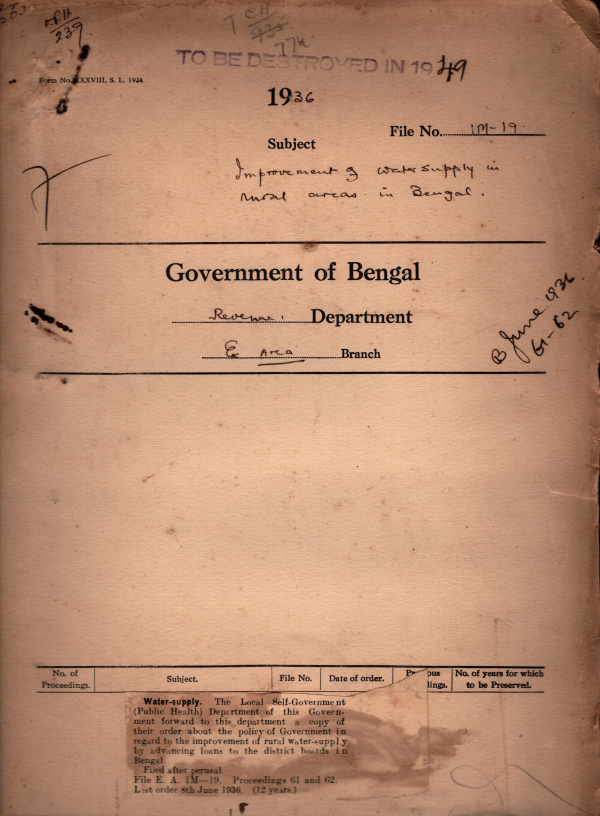 | Rack No. 39, Bundle No. 07, SI No. 432 Revision of rent of the P.W.D. Subordinates quarters at Mohalchari in the Chittagong Hill Tracts for the Period from 1st August to 30th September. | Rack No. 39, Bundle No. 07, SI No. 433 Deputy commissioner's order regarding transfer of old court house buildings to the Forest Department. | Rack No. 39, Bundle No. 07, SI No. 434 Minor works grant (Chittagong Hill Tracts) 1936-37. | Rack No. 39, Bundle No. 07, SI No. 435 Improvement of water supply in rural area in Bengal. | Rack No. 39, Bundle No. 07, SI No. 436 Permission asked for by one Gangamaya Chetreni to erect a Rest House and a water hydrant on Road Reserve land at 73/4 mile of Rishi Road in the District of Darjeeling. | Rack No. 39, Bundle No. 07, SI No. 437 Statement of temporary posts continuously in existence sense 1st April 1939. | Rack No. 39, Bundle No. 07, SI No. 438 Sanctioning the purchase of a bicycle for use in the office of the Cotton Re-Research officer Rangamati at a cost of Rs. 60. |