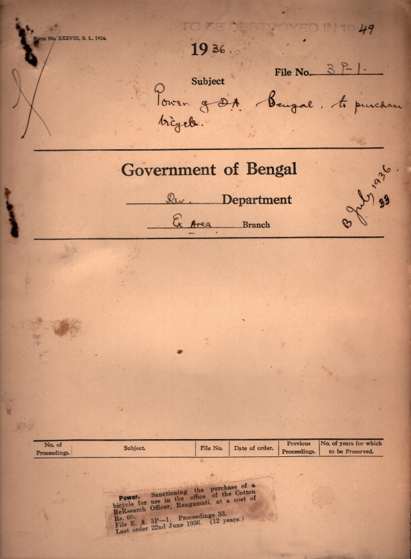 Sanctioning the purchase of a bicycle for use in the office of the Cotton Re-Research officer Rangamati at a cost of Rs. 60.