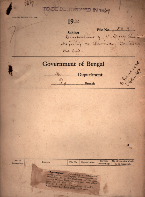 Publishing a notification reappointing the Deputy commissioner of Darjeeling to be the Chairman of the Darjaling District Board for one year with effect from the 8th may 1936.