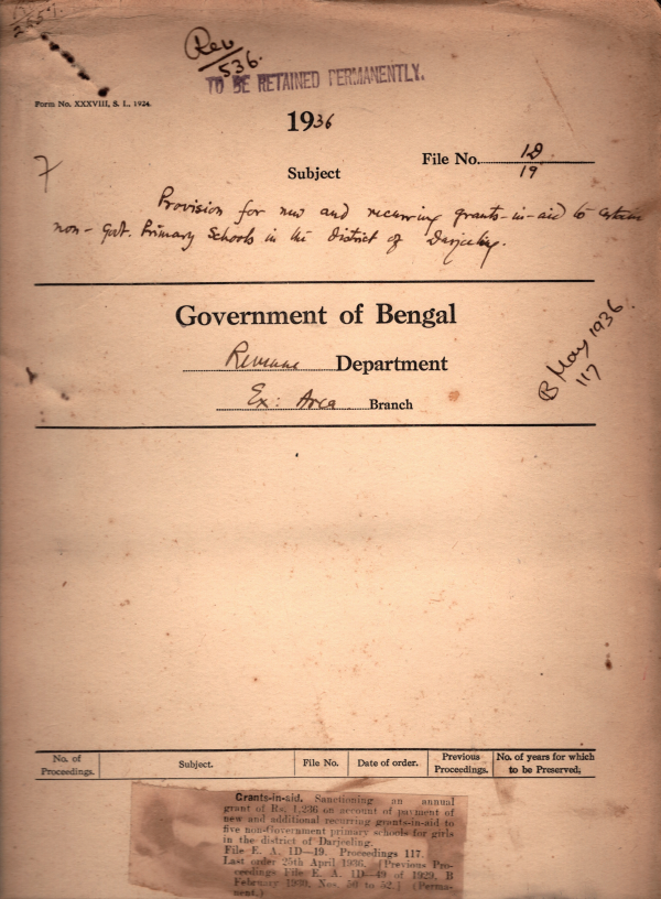 | Rack No. 39, Bundle No. 07, SI No. 445 Surrender of grants under 33 public Health during. | Rack No. 39, Bundle No. 07, SI No. 446 Maintenance of postal communication between Bandarban and Ruma in the Chittagong. | Rack No. 39, Bundle No. 07, SI No. 447 Corrigendum to the Bengal Financial Rules. | Rack No. 39, Bundle No. 07, SI No. 448 Sanctioning an annual grant of Rs. 1236 on account of payment of new and additional recurring grants in aid to five non Government primary schools for girls in the District of Darjeeling. | Rack No. 39, Bundle No. 07, SI No. 449 Bengal Comilla Cotton Scheme Increment to staff. | Rack No. 39, Bundle No. 07, SI No. 450 Lease of land at Pankhabari in Darjeeling to Longview tea company limited. | Rack No. 39, Bundle No. 07, SI No. 451 Proposal for change of the wrong the Eden sanitarium Darjeeling. |