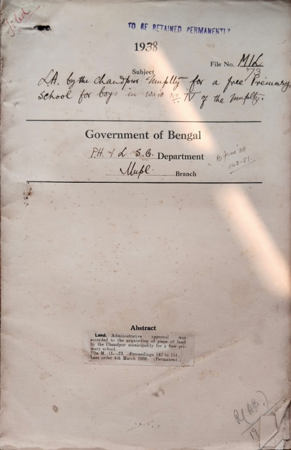 | Rack No. 12, Bundle No. 12, Sl No. 813 Exchange of Publications of this govt. of Ceylon. | Rack No. 12, Bundle No. 12, Sl No. 814 Temporary advance of Rs. 14000/- from revenue for the Supply and installation of a steam Turbine, at the Palmer's Brigade Pumping Station. | Rack No. 12, Bundle No. 12, Sl No. 815 Proposal acquisition of Permises No. 378 upper Chitpur Road for opening out a 16 ft. road connection Shibu. Thakur lane and upper Chitpur Road. | Rack No. 12, Bundle No. 12, Sl No. 816 I.A. by the Chandpur Municipality for a free Primary School for boys in ward No. IV of the Municipality. | Rack No. 12, Bundle No. 12, Sl No. 817 Reconstitution, Tollyganj Municipality. | Rack No. 12, Bundle No. 12, Sl No. 818 Payment of Rs. 100/- to the King-Emperors Anti- Tuberculosis Fund by the South Suburban Municipality. | Rack No. 12, Bundle No. 12, Sl No. 819 Adoption of the Model Building bye-laws regulating construction of buildings u/s 329 of B.M. Aet by the Champdany Municipality. |
