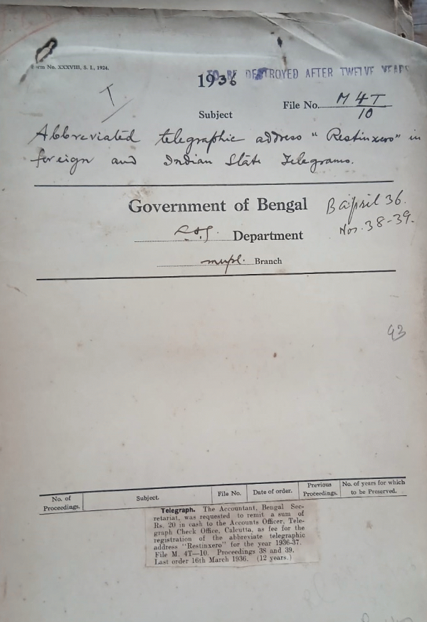 Abbreviated telegraphic address "Restinxero" in foreign and Indian State Telegrams.