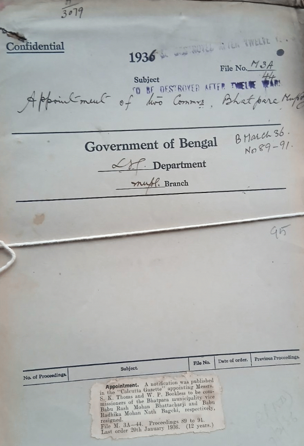 | Rack No. 12, Bundle No. 04 Sl No. 242 Adoption of model bye laws regarding standardization of weights and measures by the Baidyabati Municipality. | Rack No. 12, Bundle No. 04 Sl No. 243 Abbreviated telegraphic address "Restinxero" in foreign and Indian State Telegrams. | Rack No. 12, Bundle No. 04 Sl No. 244 Adoption of model bye laws regarding standardization of weights and measures by the Baidyabati Municipality. | Rack No. 12, Bundle No. 04 Sl No. 245 Appointment of two commissioners, Bhatpara Municipality. | Rack No. 12, Bundle No. 04 Sl No. 246 Permission asked for by one syed Sakhayat Hossain for the section of Babu Anil Kumar Chatterjee M.B.E., Chairman, Benhampore, Municipality. | Rack No. 12, Bundle No. 04 Sl No. 247 Extension of Section 415 of the B.M. Act, 1932 to the Pabna Municipality. | Rack No. 12, Bundle No. 04 Sl No. 248 Extension of Section 415 of the B.M. Act, 1932 to the Tollygunge Municipality. |