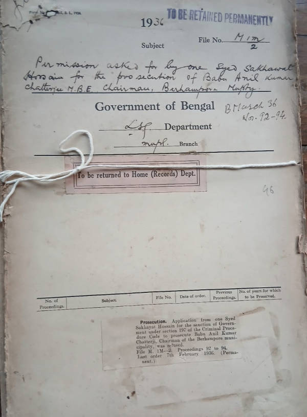 Permission asked for by one syed Sakhayat Hossain for the section of Babu Anil Kumar Chatterjee M.B.E., Chairman, Benhampore, Municipality.