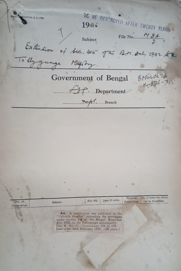 | Rack No. 12, Bundle No. 04 Sl No. 245 Appointment of two commissioners, Bhatpara Municipality. | Rack No. 12, Bundle No. 04 Sl No. 246 Permission asked for by one syed Sakhayat Hossain for the section of Babu Anil Kumar Chatterjee M.B.E., Chairman, Benhampore, Municipality. | Rack No. 12, Bundle No. 04 Sl No. 247 Extension of Section 415 of the B.M. Act, 1932 to the Pabna Municipality. | Rack No. 12, Bundle No. 04 Sl No. 248 Extension of Section 415 of the B.M. Act, 1932 to the Tollygunge Municipality. | Rack No. 12, Bundle No. 04 Sl No. 249 Calcutta Municipal (Amendment No. II) Bill, 1933 by Mr. P. Banerji, M.L.C. | Rack No. 12, Bundle No. 04 Sl No. 250 Supply of information to the Govt. of Bihar and Orissa regarding the payment of Salary and allowance to the Govt. officer holding Charge of a Superseded Municipalities. | Rack No. 12, Bundle No. 04 Sl No. 251 Appointment of a Commissioner, Jhalakati Municipality. |