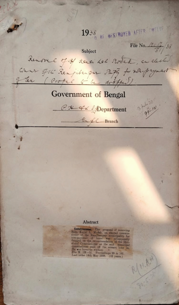 Proposal for removal of Babu Kanai Lal Modak, Commissioner, Ranjibanpore Municipality.