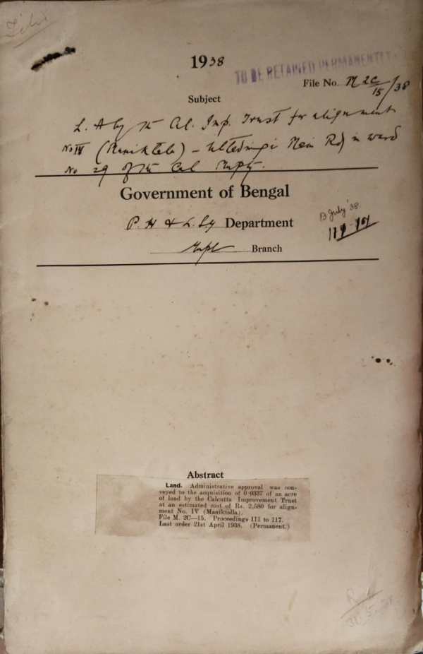 | Rack No. 12, Bundle No. 12, Sl No. 820 Scheme for exchange of Publications with govt. | Rack No. 12, Bundle No. 12, Sl No. 821 C. by Mr. W.H. Thomson, regarding the approaches to the New Howrah Bridge. | Rack No. 12, Bundle No. 12, Sl No. 822 Proposal for removal of Babu Kanai Lal Modak, Commissioner, Ranjibanpore Municipality. | Rack No. 12, Bundle No. 12, Sl No. 823 I.A. by the Calcutta Corporation Trust for alignment No. IV (Maniktalla) in ward No. 29 of the Calcutta Municipality. | Rack No. 12, Bundle No. 12, Sl No. 824 General election of the commissioners of the Mohespur Municipality in the District of Jessore. | Rack No. 12, Bundle No. 12, Sl No. 825 Rules for the payment of additional contribution to the P.F. accounts of the employees of Serampore Municipality. | Rack No. 12, Bundle No. 12, Sl No. 826 Proposed deputation of the Calcutta corporation Employees Association to H. M. relating to the Introduction of Privilege leave to Block Sircarrs Calcutta Corporation. |
