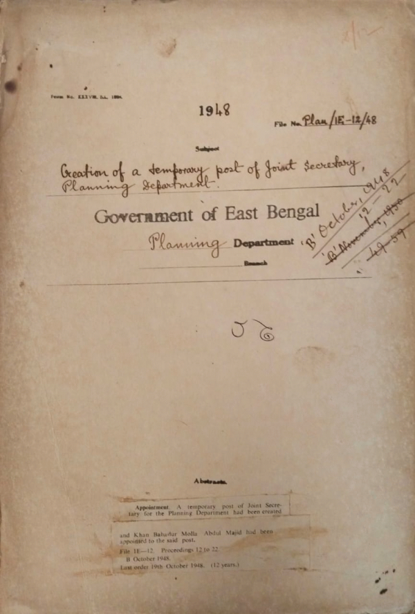 | Rack No. 36, Bundle No. 01, SI No. 22 Ntification of appointment of khan Bahadure M.A. Majid as deputy secretary planning deptt. | Rack No. 36, Bundle No. 01, SI No. 23 Grant of a permanent advance of Rs. 50/- to the director of purchase chittagong. | Rack No. 36, Bundle No. 01, SI No. 24 Security of Broadcast material. | Rack No. 36, Bundle No. 01, SI No. 25 Creation of a temporary post of joint secretary, planning deptt.. | Rack No. 36, Bundle No. 01, SI No. 26 Report on the activities of the planning deptt. | Rack No. 36, Bundle No. 01, SI No. 27 Sterling Agreement between U.K. and Pakistan. | Rack No. 36, Bundle No. 01, SI No. 28 Buildings in connection with five year plan procurement of materials etc. |