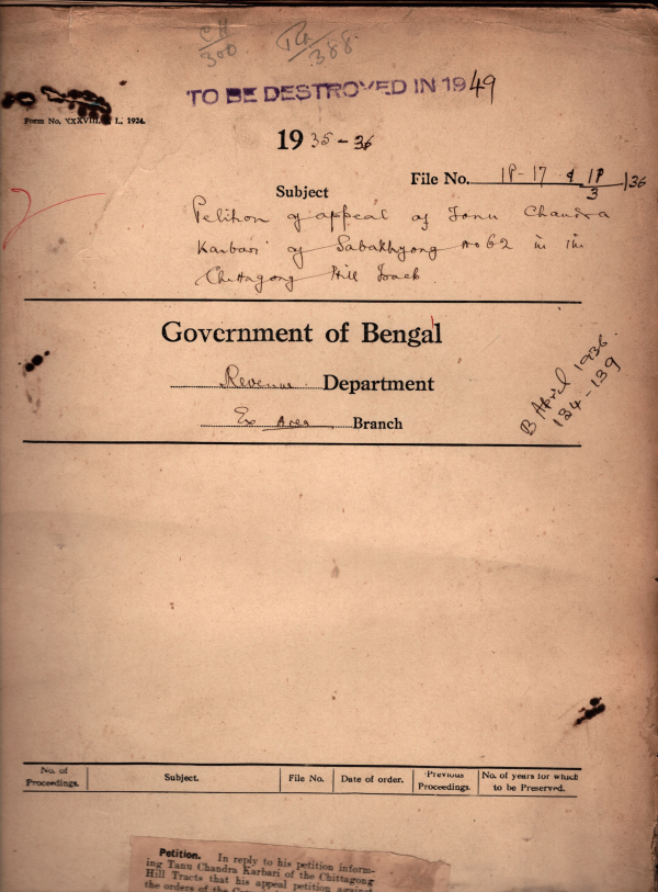 Petition of appeal of Tanu Chandra Karbari of Sabalehyong no 62 in the Chittagong Hill Tracts.