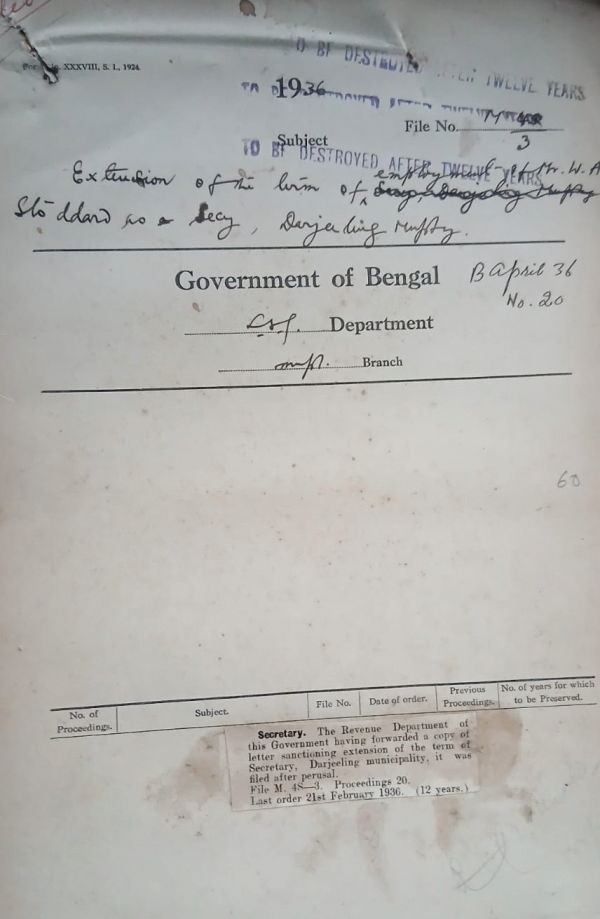 | Rack No. 12, Bundle No. 04 Sl No. 257 Post and Telegraph Mannual Vol. 1 (Part II). | Rack No. 12, Bundle No. 04 Sl No. 258 Reconstitution, Joynagar Municipality. | Rack No. 12, Bundle No. 04 Sl No. 259 Contribution of Rs. 25/- by the North Barrackpore Municipality to the British Empire Leprosy Association for 1935-36. | Rack No. 12, Bundle No. 04 Sl No. 260 Extension of the term of Secretary, Darjeeling Municipality. | Rack No. 12, Bundle No. 04 Sl No. 261 Contribution of Rs. 4000/- year to the Jadavpur Tuberculosis Hospital for reservation of 4 beds for Patients from Howrah town. | Rack No. 12, Bundle No. 04 Sl No. 262 Raising of taxes for the expenditure required for the 1936 construction of a town at Maijdi (Noakhali). | Rack No. 12, Bundle No. 05 Sl No. 263 Calcutta Municipal (Amendment) Bill. |