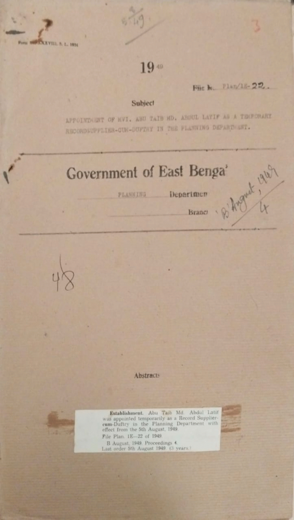 Appointment of MVI. Abu taib Md. Abdul latif as a temporary records supplier cum daftly in the planning deptt.