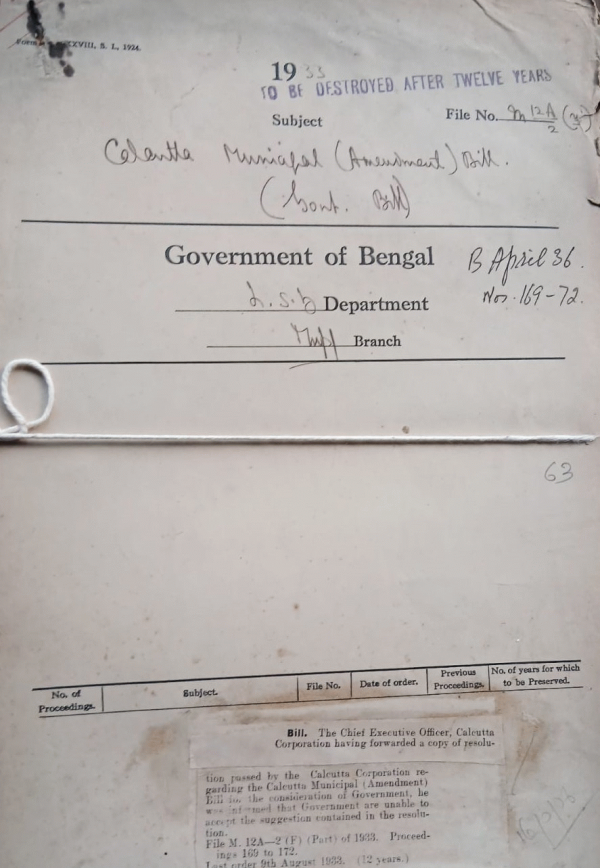 | Rack No. 12, Bundle No. 04 Sl No. 260 Extension of the term of Secretary, Darjeeling Municipality. | Rack No. 12, Bundle No. 04 Sl No. 261 Contribution of Rs. 4000/- year to the Jadavpur Tuberculosis Hospital for reservation of 4 beds for Patients from Howrah town. | Rack No. 12, Bundle No. 04 Sl No. 262 Raising of taxes for the expenditure required for the 1936 construction of a town at Maijdi (Noakhali). | Rack No. 12, Bundle No. 05 Sl No. 263 Calcutta Municipal (Amendment) Bill. | Rack No. 12, Bundle No. 05 Sl No. 264 Fire Bridge Report 1932. | Rack No. 12, Bundle No. 05 Sl No. 265 Extension of the Calcutta Hackney Carriage Act, 1919, to the Garden Reach Municipality. | Rack No. 12, Bundle No. 05 Sl No. 266 Dispute in the Education of Chairman of Jalpaiguri Municipality. |