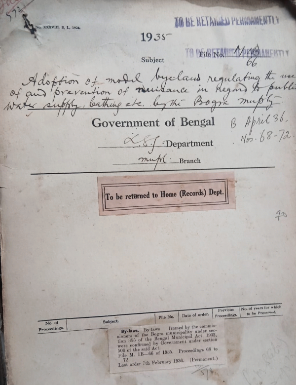 Adoption of model byelaws regulating the use of and Prevention of nuisance in regard to Public water Supply bathing and washing places etc by the Bogra Municipality.