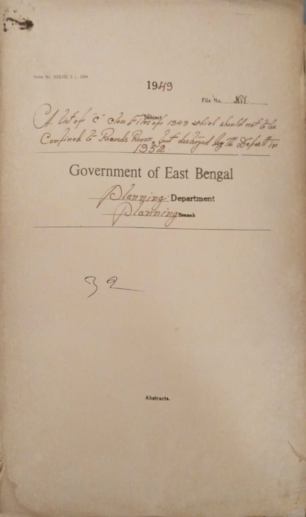 | Rack No. 36, Bundle No. 01, SI No. 67 Public investment enquiry committee. | Rack No. 36, Bundle No. 01, SI No. 67(A) All india muslim civil employees provident fund society in liquidation. | Rack No. 36, Bundle No. 01, SI No. 68 Departments establishment ministrial. | Rack No. 36, Bundle No. 01, SI No. 69 A list of ''C'' class files of 1949 which should not be confined to record room but destroyed by the department in 1952. | Rack No. 36, Bundle No. 01, SI No. 70 Appointment of moulvi Zaimul Abedin a temporary upper divission assistant in the planning deptt. | Rack No. 36, Bundle No. 01, SI No. 71 Recruitment of experts. | Rack No. 36, Bundle No. 01, SI No. 72 Development of chittagong port. |
