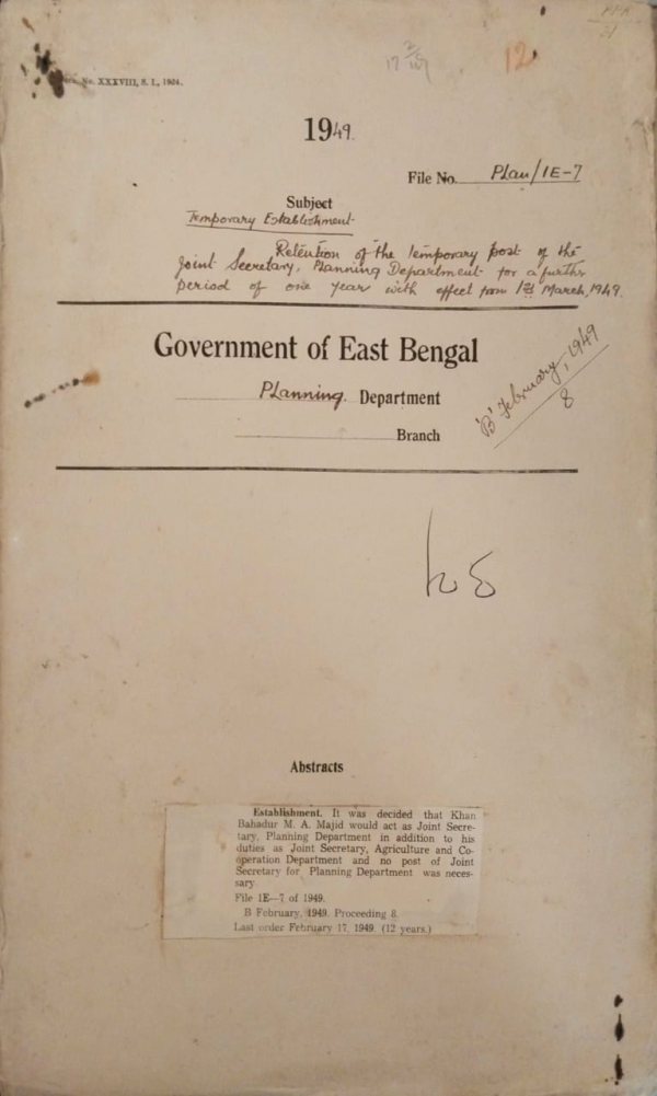 | Rack No. 36, Bundle No. 01, SI No. 70 Appointment of moulvi Zaimul Abedin a temporary upper divission assistant in the planning deptt. | Rack No. 36, Bundle No. 01, SI No. 71 Recruitment of experts. | Rack No. 36, Bundle No. 01, SI No. 72 Development of chittagong port. | Rack No. 36, Bundle No. 01, SI No. 73 Retention of the temporary post of the Joint secretary,planning deptt. for a further of 1 year with effect from 1st March,1949. | Rack No. 36, Bundle No. 01, SI No. 74 Delegation of powers. | Rack No. 36, Bundle No. 01, SI No. 75 Procedure for tendering money for deposit on government account. | Rack No. 36, Bundle No. 01, SI No. 76 British council Bursaries. |